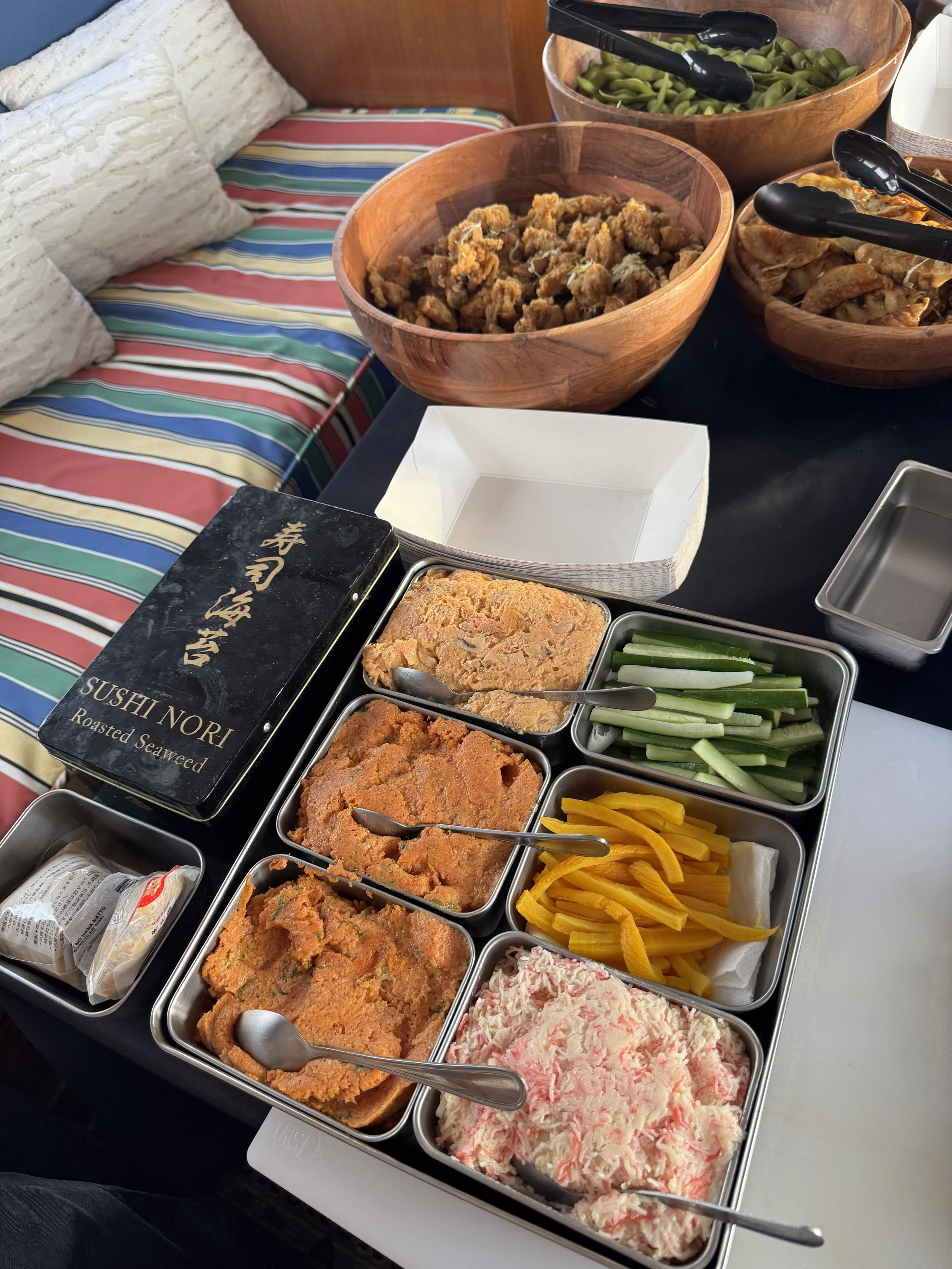 A selection of veggie, scallop, crab, and spicy tuna hand rolls wrapped fresh to order, pork gyoza, mochiko chicken, and edamame by Pitch Hawai’i provided for a delicious spread of local pupus ending with sweet treats of delightful Swiss-French fruit tarts and canelé from Ocean Side Bakery on board this iconic Waikiki sunset sail.